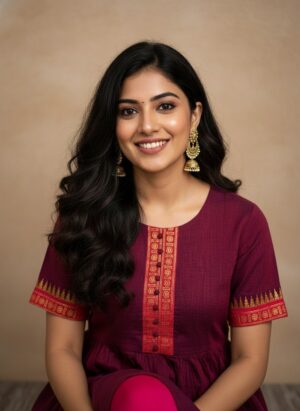 - Garment Color: Maroon with a gathered or pleated section at the bottom.