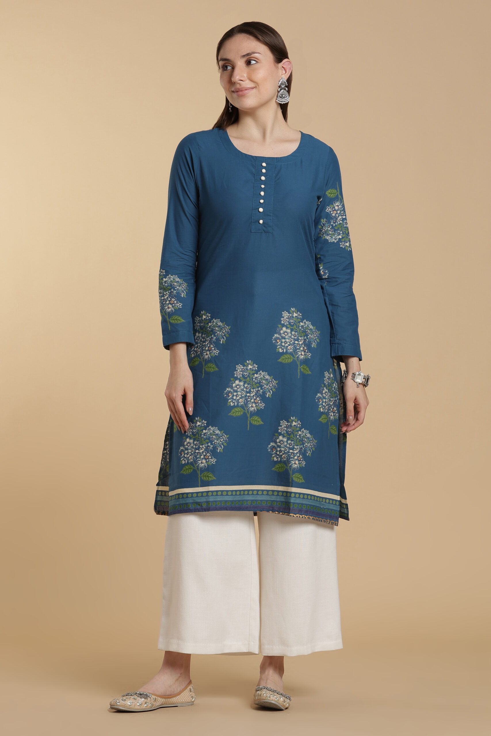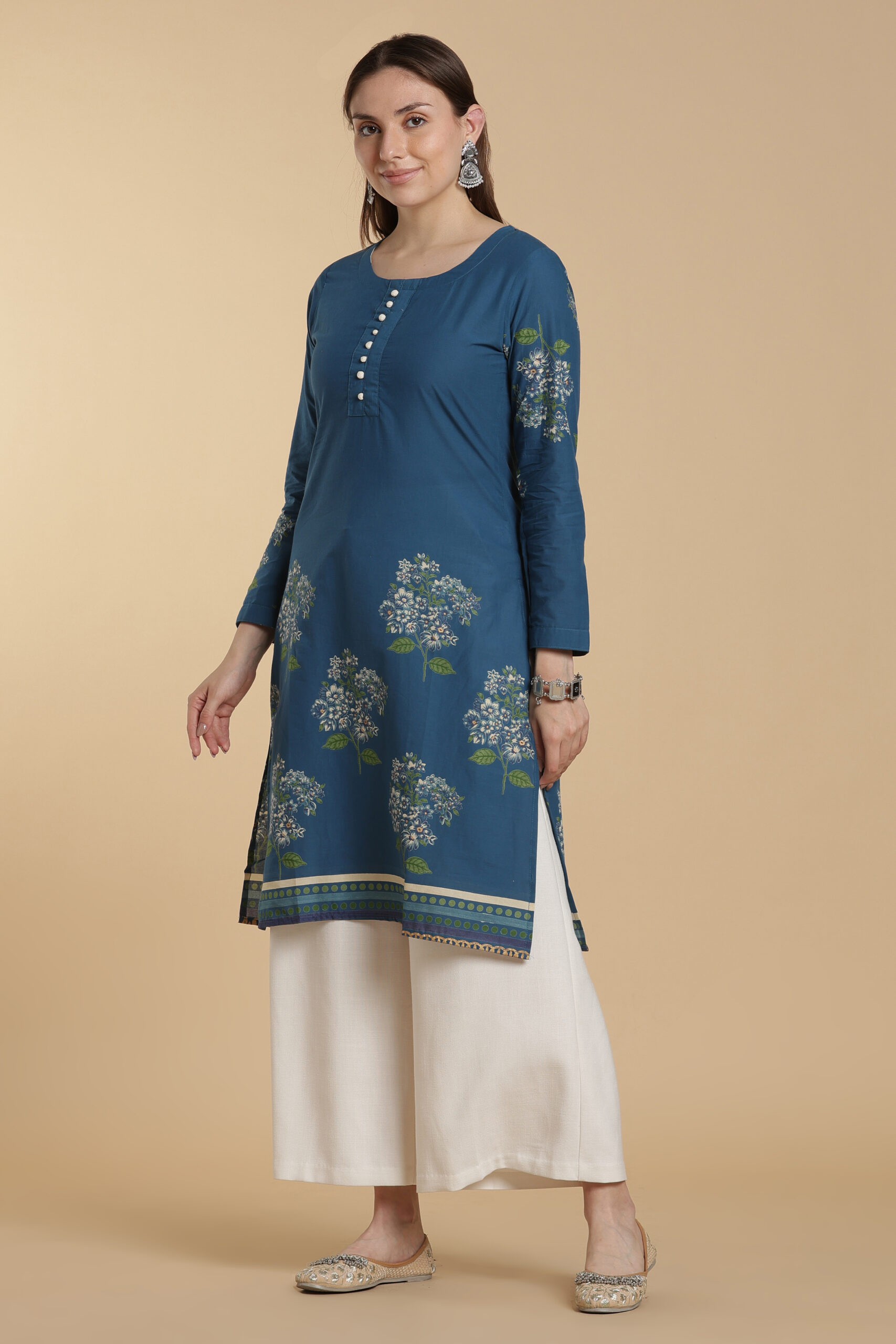 Made from soft, breathable pure cotton, this kurti features a delicate mini floral and little leaf print on a soothing blue base. The subtle design gives a fresh and elegant look, perfect for everyday wear.