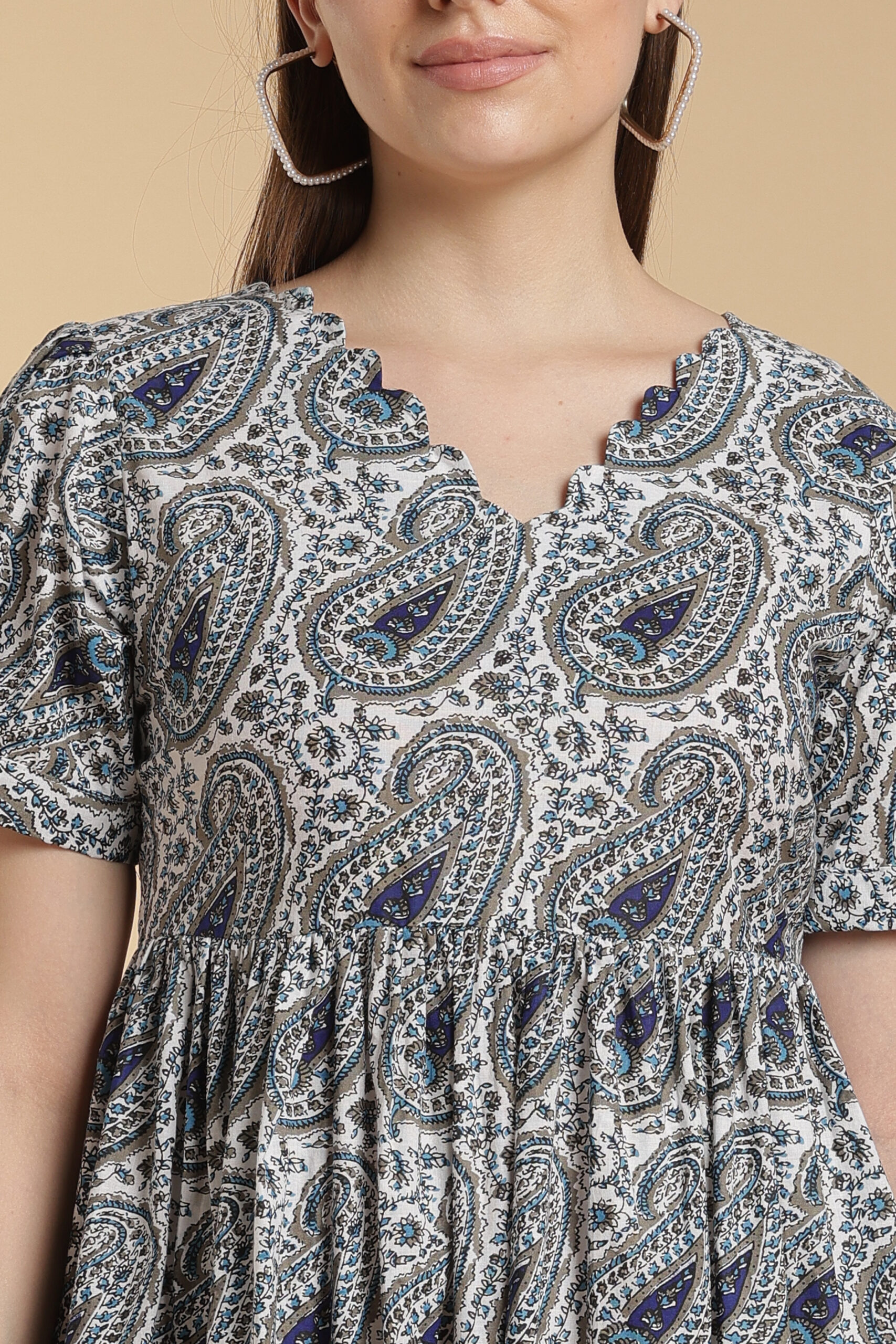 Made from soft, breathable pure cotton, this gown is designed for all-day comfort and effortless style. Featuring a delicate V-neckline with scallop detailing and subtle cotton prints on a soothing white base, it gives a light, airy feel—just like a cloud.