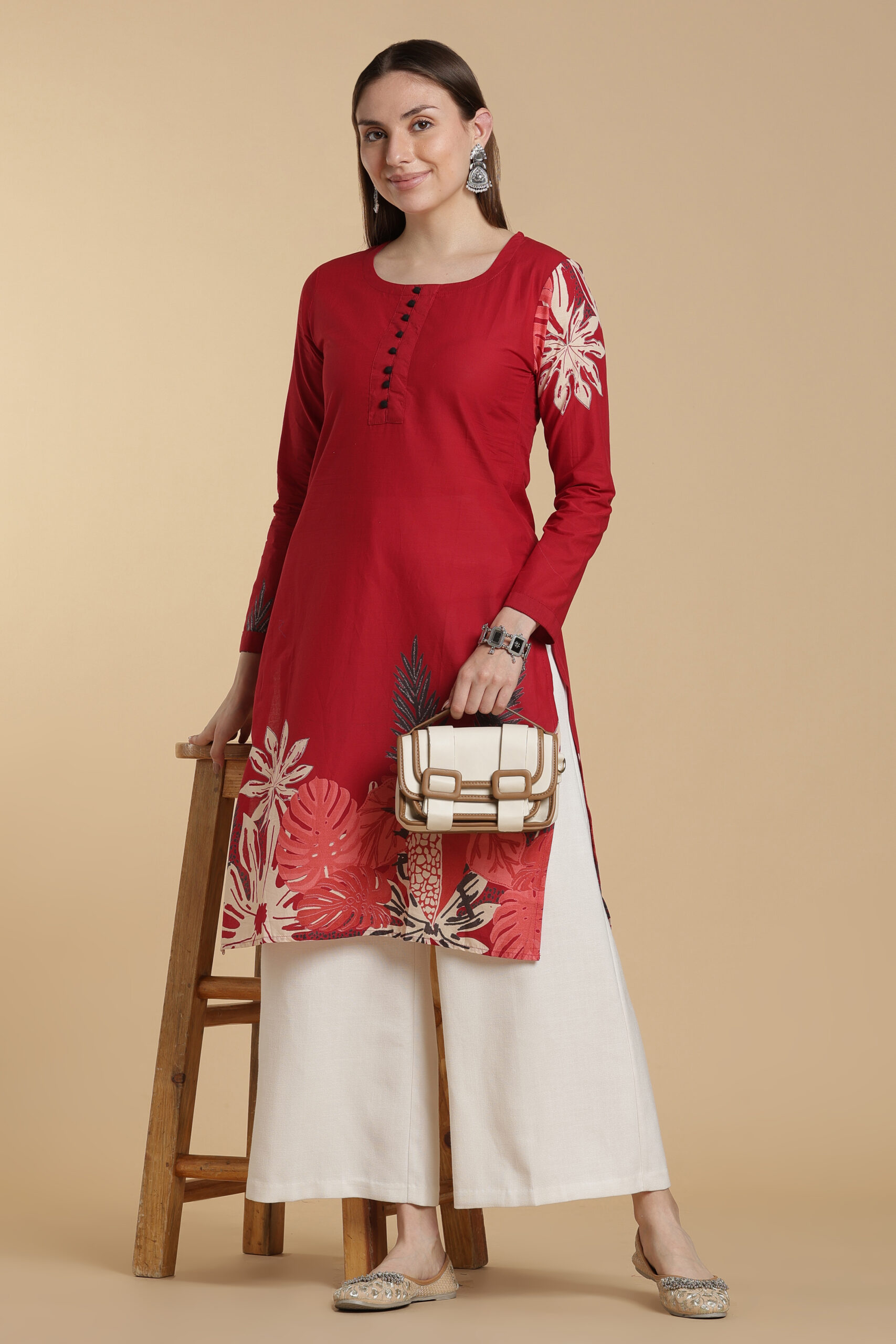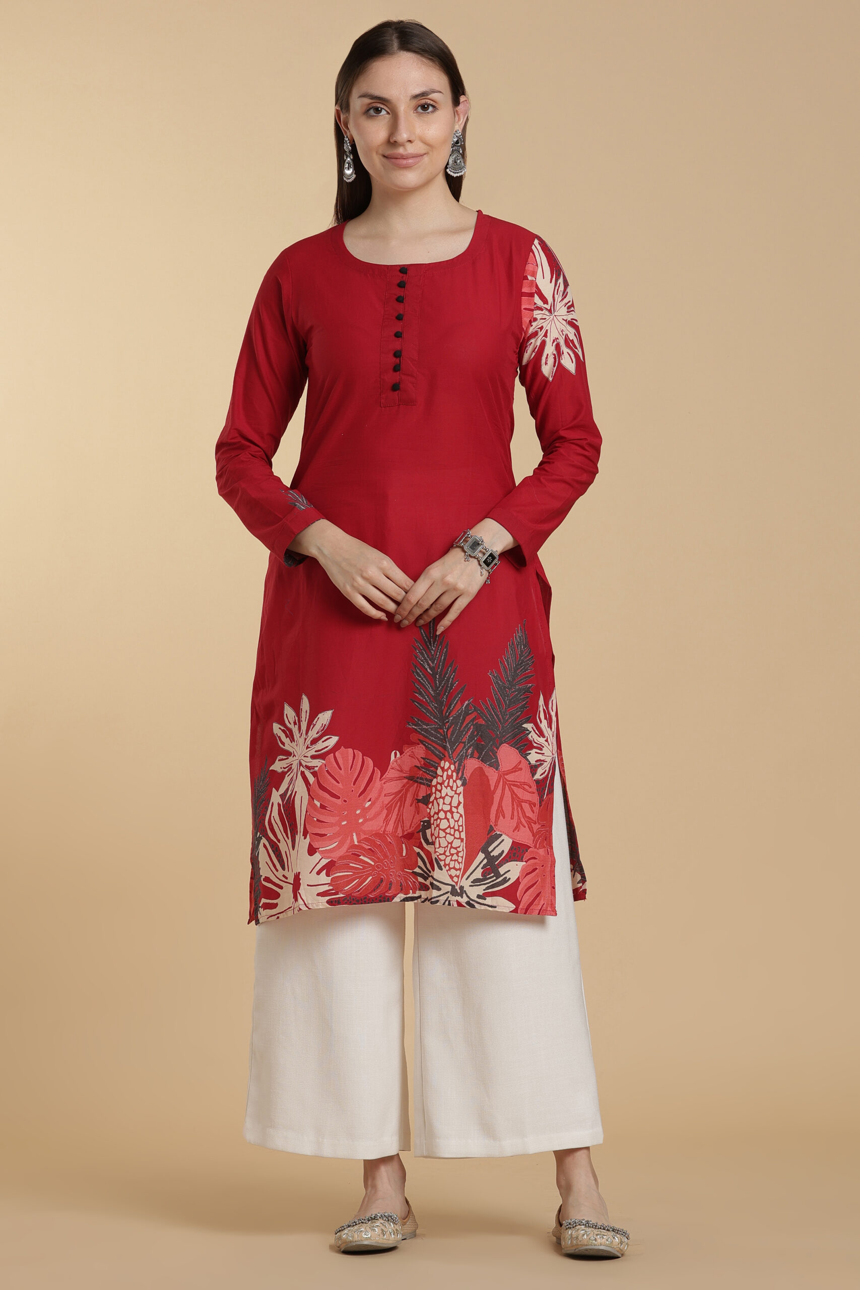 Made from soft, breathable pure cotton, this kurti features a subtle wild leaf design on a rich red base, giving it a bold yet elegant look. Designed with a comfortable fit, it is perfect for everyday wear.