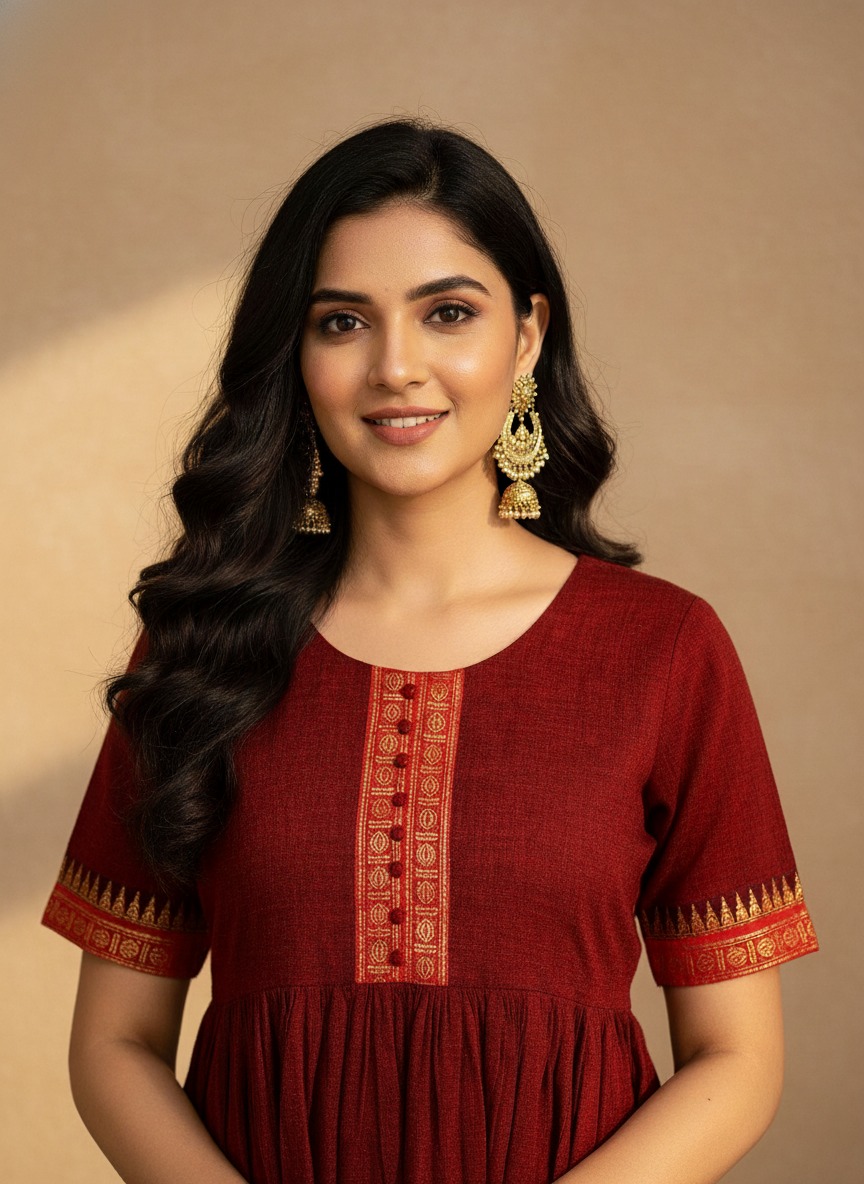 • Garment Color: Maroon with a gathered or pleated section at the bottom.